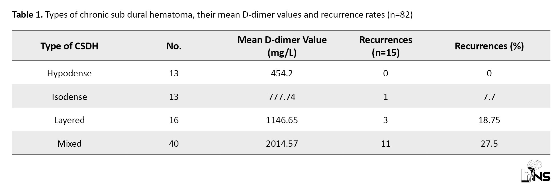 One of the sensitive markers for fibrinolysis is D-dimer, a fibrin degradation product [5]. All patients with CSDH have a high level of D-dimer in their clots. Studies have attempted to correlate the level of D-dimer in the clot and the risk of recurrence, as well as radiological subtypes. In this study, we attempt to measure the D-dimer levels in the clots and correlate these markers with the radiological appearance and recurrence.