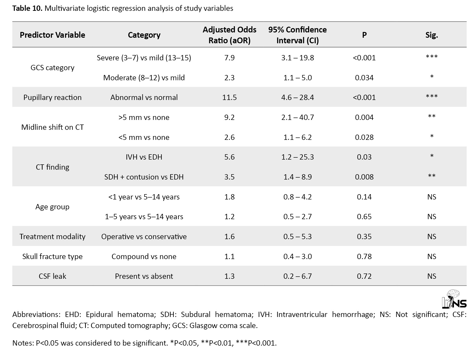 Around the world, TBI is a significant factor in both death and disability in children and young people [24]. The mechanism, clinical symptoms, and consequences following TBI are still poorly known, even though the condition is on the rise. There has not been much research examining TBI among children, particularly those from the Indian subcontinent, even though they make up a sizable portion of the population who are at risk. Children have a special vulnerability that may be caused by a predisposition to injury, mechanical characteristics like a large head and weak neck muscles, and neurobiological variables like biochemical and molecular pathways important for brain maturation that may further harm the growing brain. Multivariate analysis confirms that neurological status at presentation (GCS, pupil reactivity) and CT imaging findings (midline shift, intraventricular hemorrhage, combined injuries) are independent and statistically significant predictors of poor outcomes in paediatric TBI. These variables should be prioritized in triage, risk stratification, and early clinical decision-making. Demographic variables like age and structural injuries, such as fractures, had no independent prognostic value after adjustment.