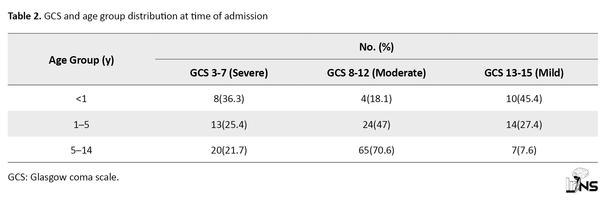A total of 165 TBI patients aged up to 14 years, with a Mean±SD age of 9.22±3.16 years. Among recruited study participants, 114(69.09%) patients were males, and 51(30.90%) patients were females, with a male‑to‑female ratio of 2.24:1.