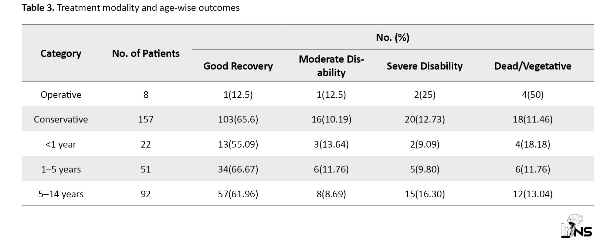 Operative treatment was administered to 8 patients, with 50% experiencing poor outcomes (dead/vegetative state), while conservative management was applied to 157 patients, yielding better results (65.6% good recovery). Age-wise analysis demonstrated the highest good recovery rates in the 1–5 years age group (66.67%), followed by the 5–14 years group (61.96%) and the <1 year group (55.09%). Severe disability and mortality were more prevalent in the operative group and the youngest age group (<1 year;