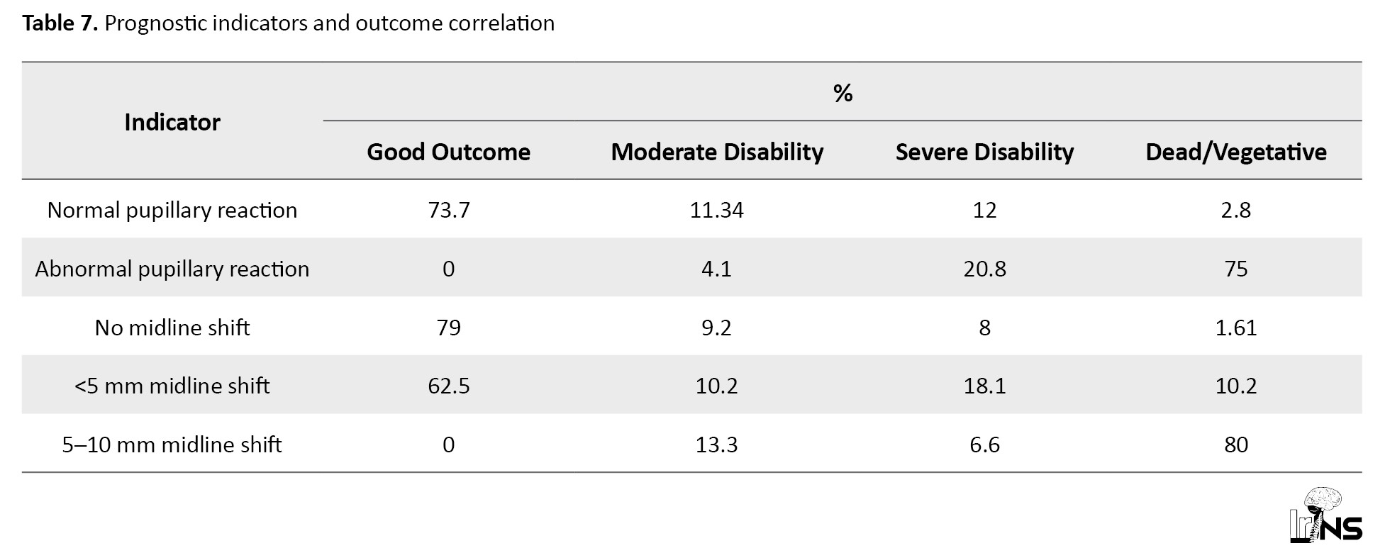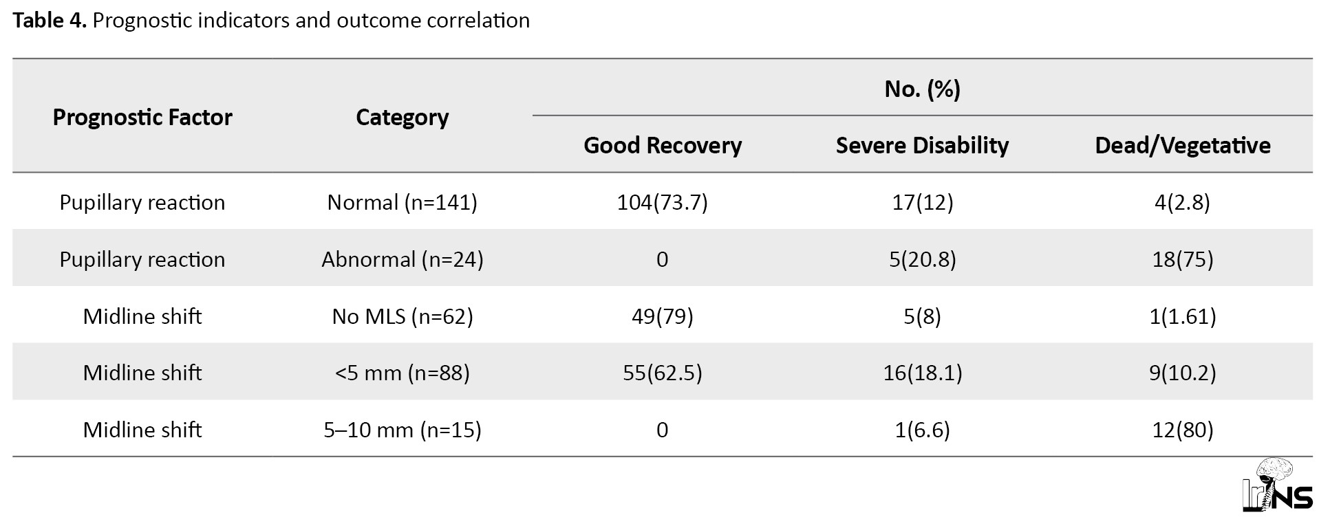 Normal pupillary reaction was strongly associated with good recovery (73.7%), whereas abnormal pupillary reaction correlated with poor outcomes (75% dead/vegetative). Midline shift also influenced outcomes: Patients with no midline shift had the highest good recovery rate (79%), while those with a 5–10 mm shift had the worst prognosis (80% dead/vegetative). These indicators underscore the critical role of neurological and imaging findings in predicting patient outcomes (