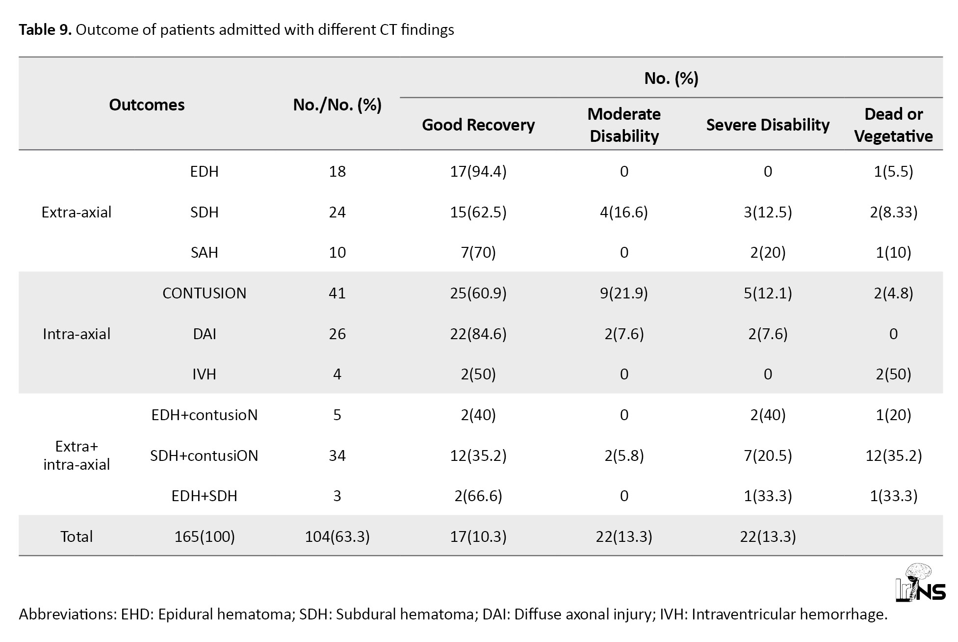The outcome was evaluated using age, gender, GCS, pupil size and reaction, CT scan features, intervention, and associated injuries. Multivariate logistic regression analysis of study variables was performed to identify independent prognostic factors.